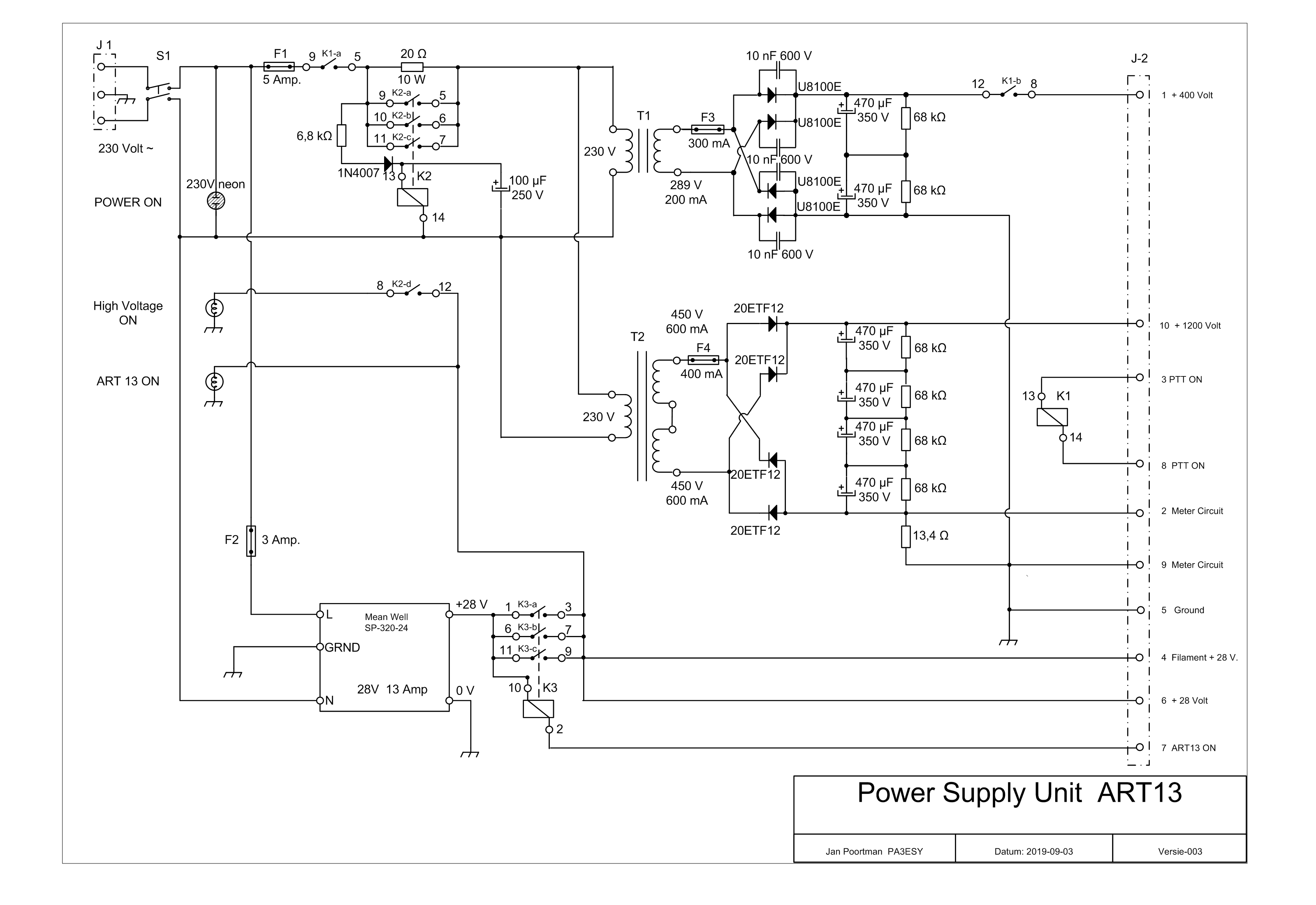 De zekeringen aan de secundaire kant van de trafo's zijn ook wat kleiner gemaakt, de voeding levert nu belast ongeveer 1200 Volt en 400 Volt.