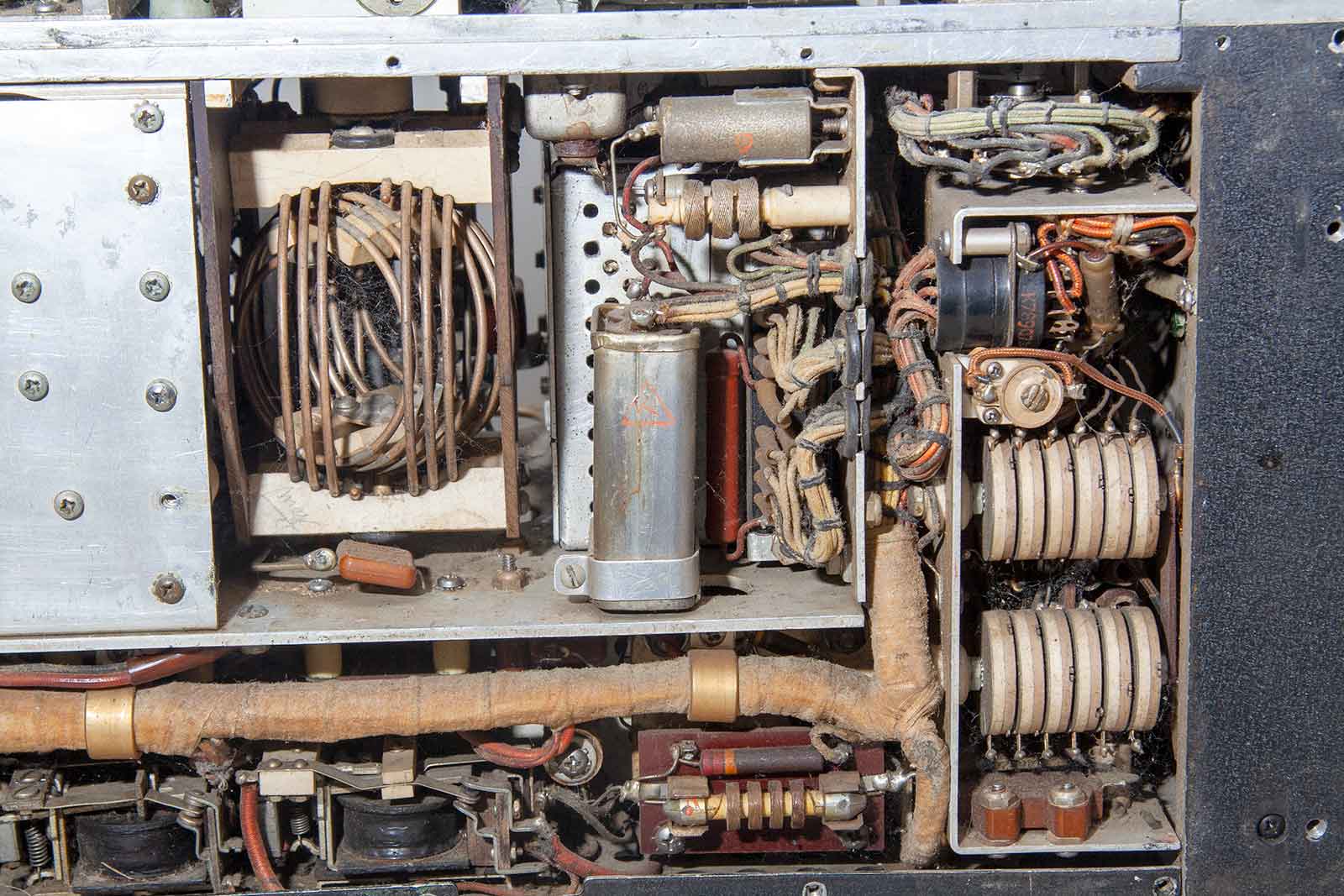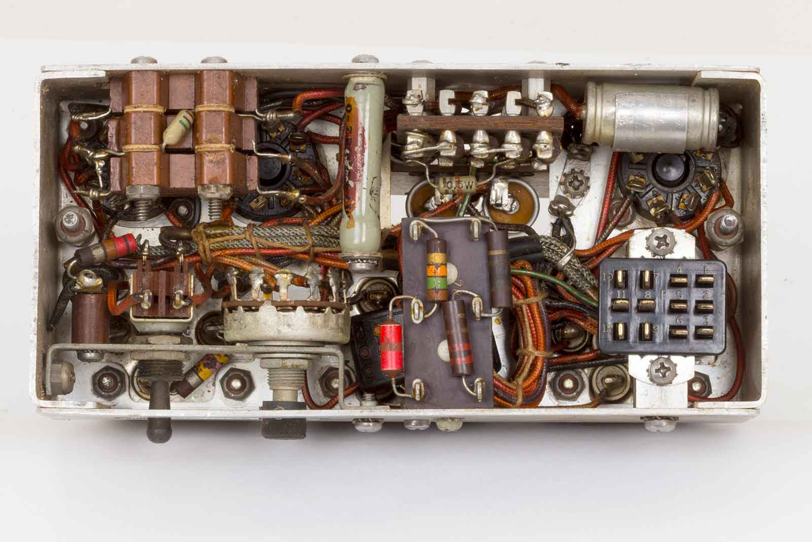 Het inwendige van de HF-Oscillator, met permeabiliteits-afstemming. Rechts de spoelen van de multiplier. Er lagen ook talrijke dode insecten in de compartimenten.