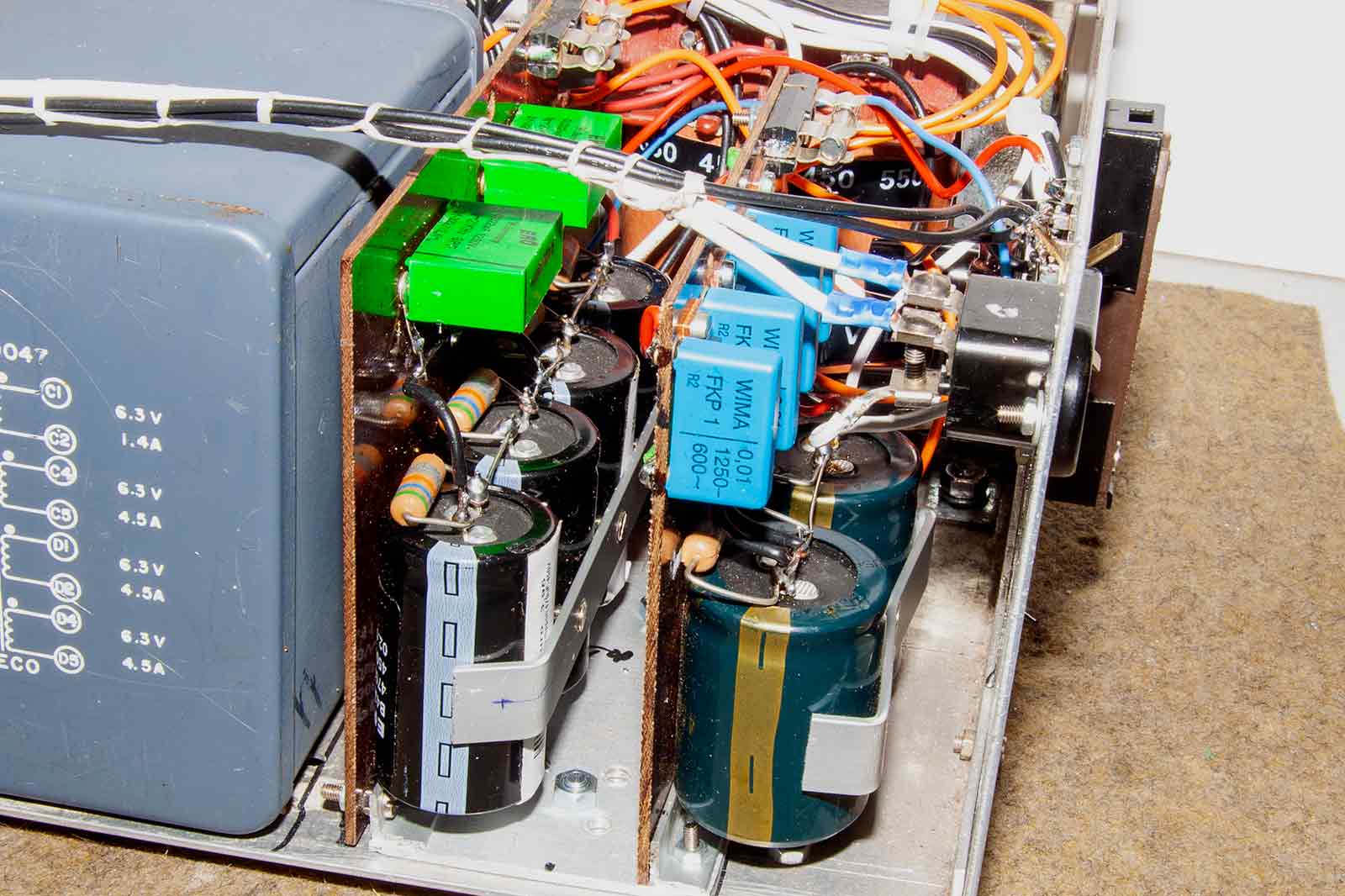 .Een blik op de twee gelijkrichtmodules, de linker is een spanningsverdubbelaar voor de hoogspanning. Rechts met de blauwe condensatoren de bruggelijkrichter voor de 400 Volt.