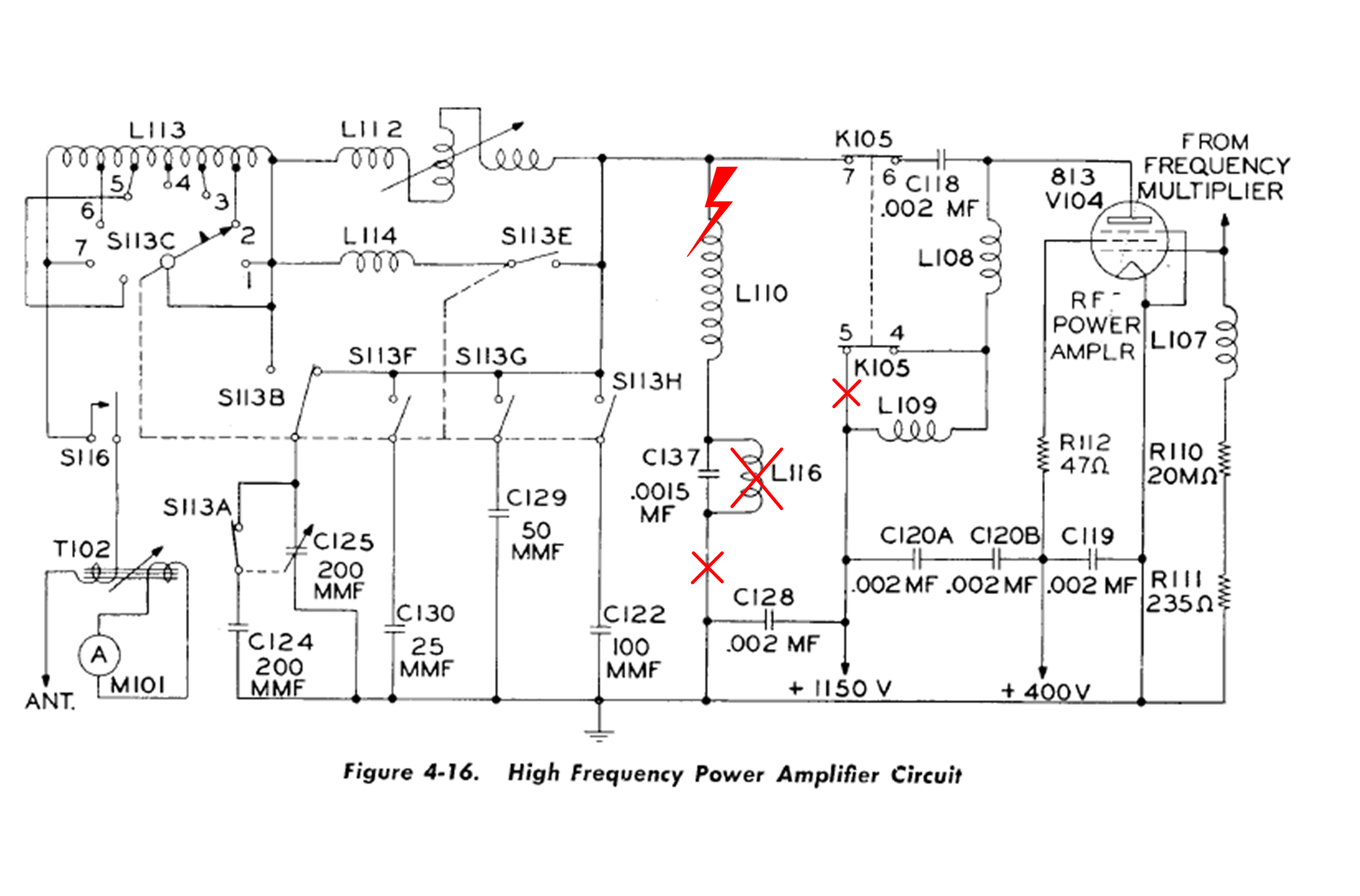 De schade is nu bekend, op een HF-smoorspoel, L 110 van de HF-eindtrap is door een te hoge HF-spanning een vlamboog ontstaan die op zijn beurt een kool-laagje heeft achter gelaten op de keramische bevestiging van deze spoel. De zender werkt dus wel, maar wanneer de veodingsspaning boven de 400 Volt komt wordt er weer zoveel HF-spanning geproduceerd dat de koolbaan gaat geleiden en er weer een vlamboog ontstaat.
