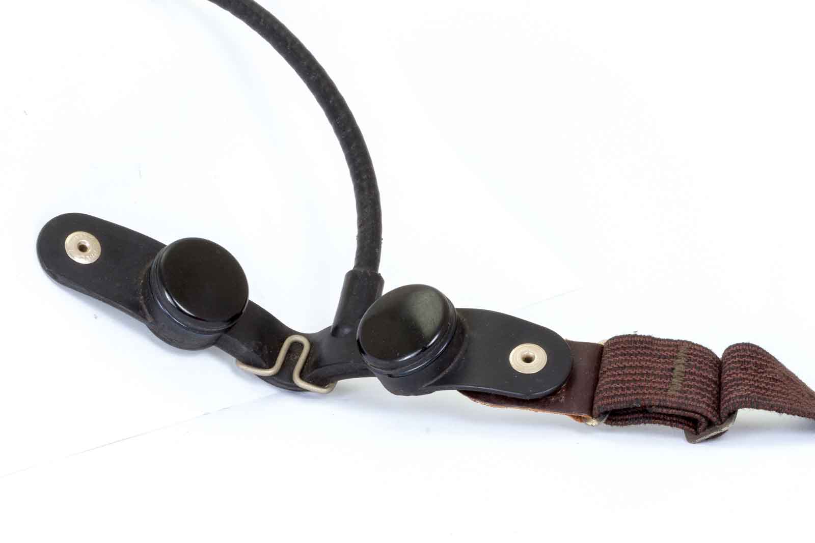Dit is het bijbehorende schakel-kastje voor de microfoon. Het is de bedoeling dat je dit ding met een lederen riem om je nek hangt. Eén kabel gaat naar de microfoon en de andere (langere) waar de microfoonplug aan zit wordt in de zender gestopt.
