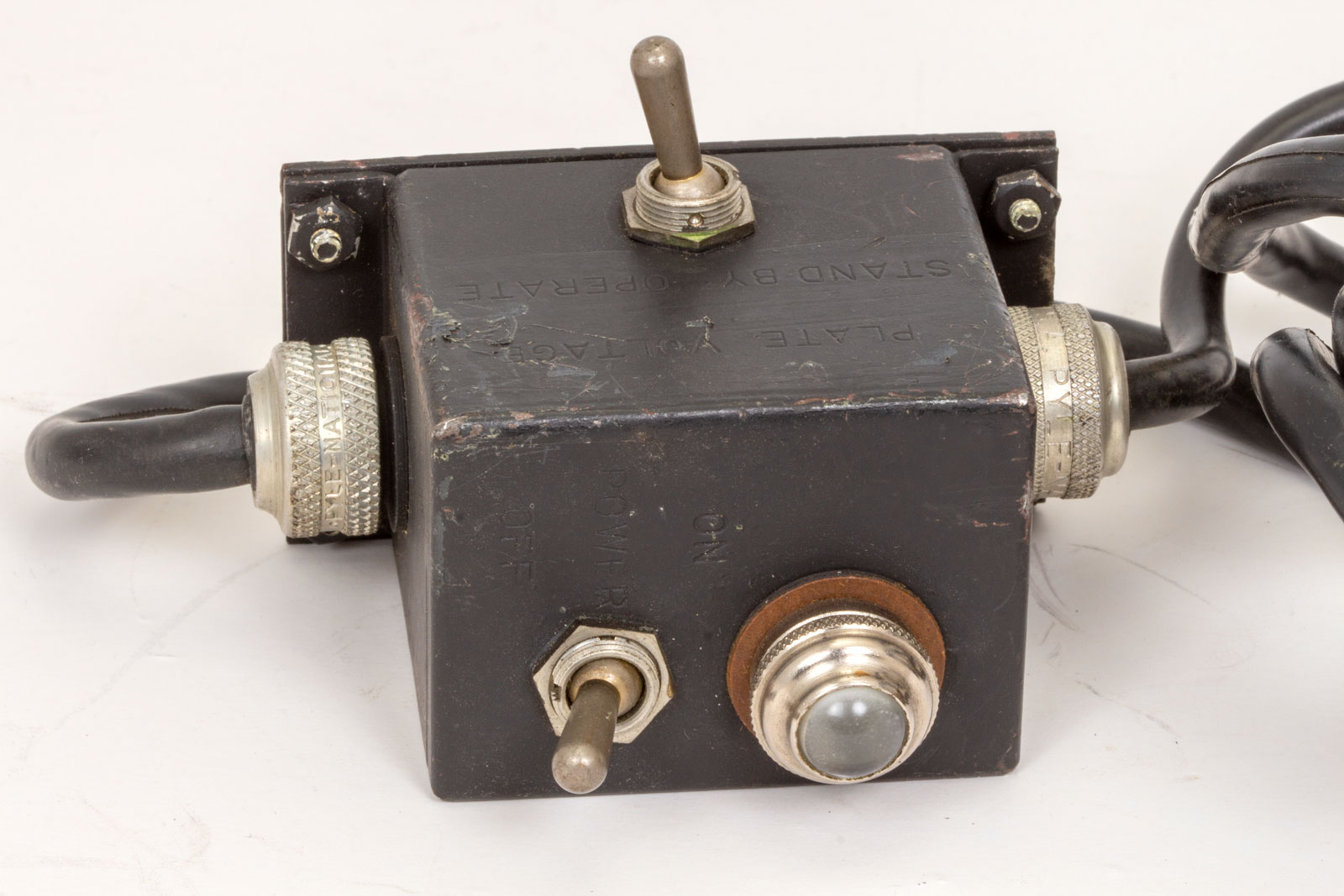 De snoerschakelaar met "Pilot-light" en twee schakelaars. Als je goed kijkt zie je bij de schakelaar boven, de standen "Plate Voltage", "Stand By" en "Operate" staan.