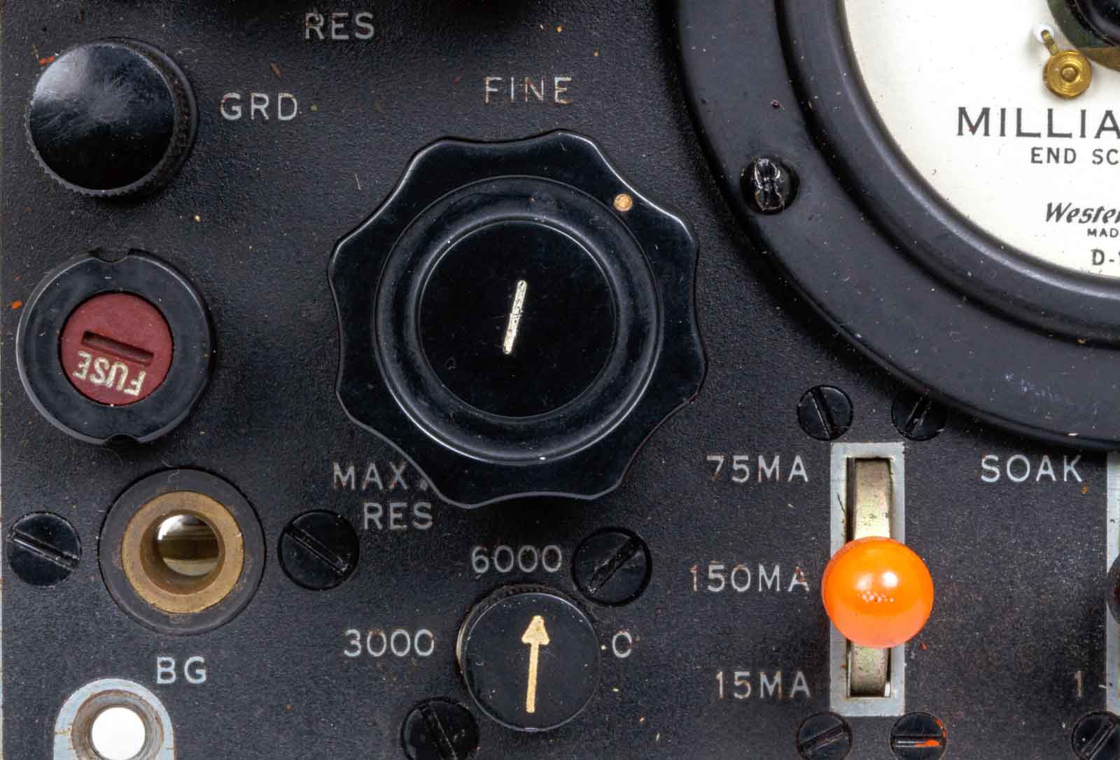 Achteraanzicht met twee grote draadgewonden potmeters en het meet-instrument. De bedrading is van zeer goede kwaliteit en gaat zeker een eeuw mee.