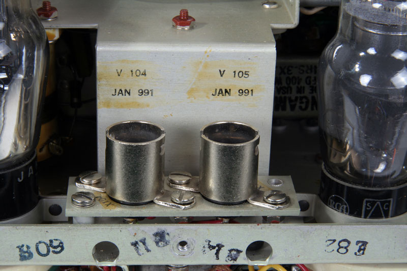 De achterkant met de ontbrekende V104 en V105, dat zijn JAN 991 types, neonlampjes voor de stabilisatie van de voedingsspanning. Hoe kom je daar aan ??