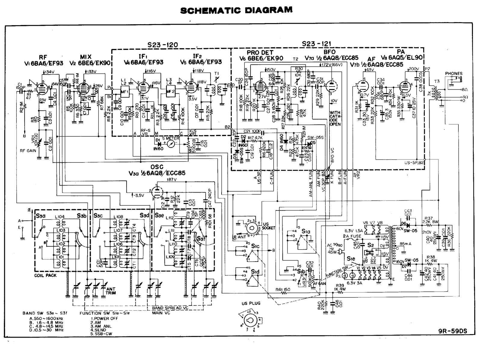 Hierbij het schema van de RF-versterker. Denk vooral aan de stop-weerstand in de signaalroosterleiding. Deze moet 1 kOhm groot zijn anders begint de buis behoorlijk wild te oscilleren. Een schotje op de buisvoet maken helpt niet veel, de weerstand wel. Het resultaat is een zeer gevoelige ontvanger op alle banden.