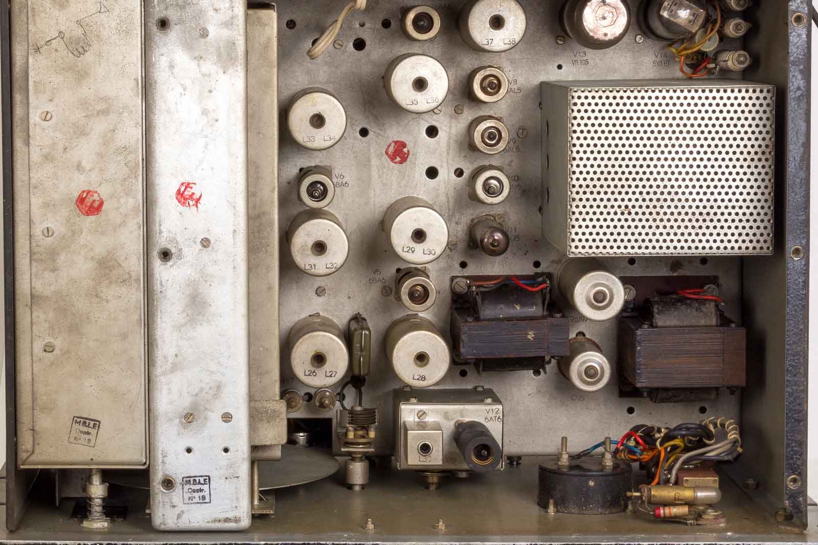 Een scheeps-ontvanger van de firma M.B.L.E. Ook afkomstig uit de collectie van Pieter Lamers. Volgens hem een lichtgewicht, in mijn beleving heel anders. Je tilt je er een breuk aan. Maar dat ter zijde. Bouwjaar waarschijnlijk rond 1957?????.