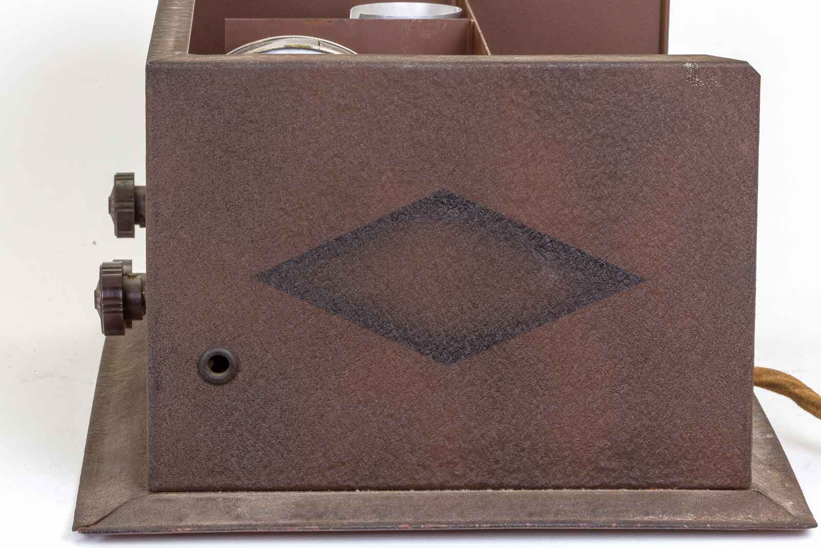 Het vooraanzicht, er staan geen teksten bij de knoppen. Met de meest linkse ( potentiometer) wordt de terugkoppeling van de detector geregeld. De middelste knop is voor de afstemming en de rechtse voor de antenne-aanpassing.