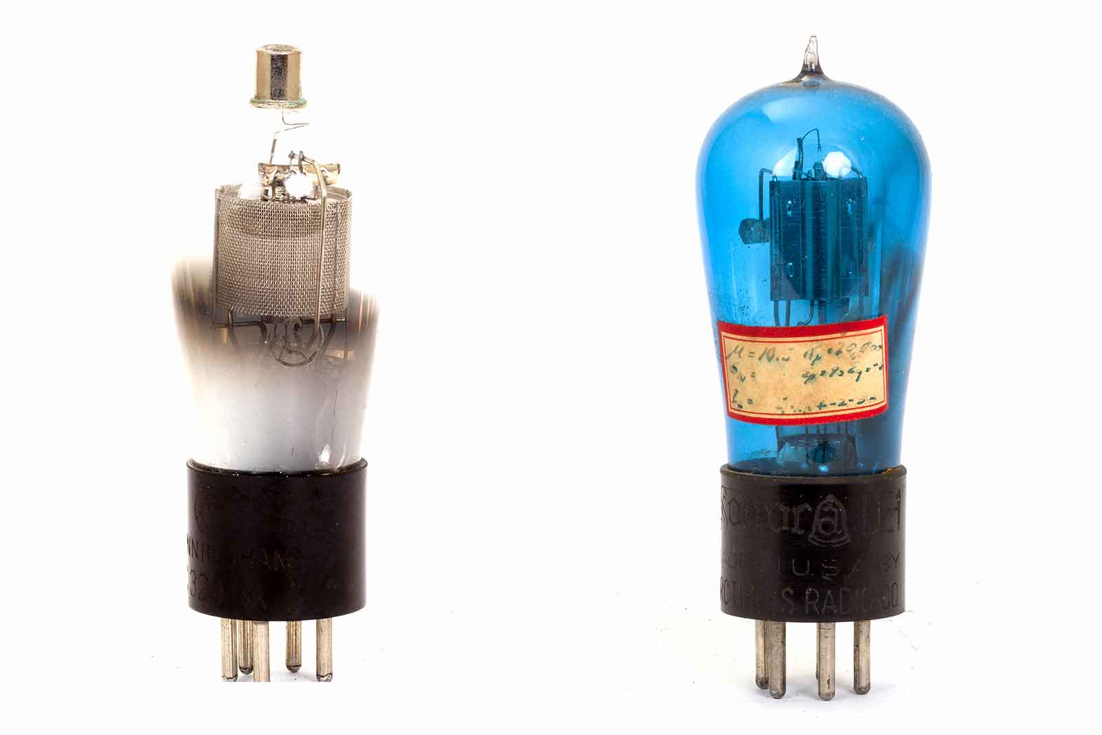 De twee types buizen die gebruikt zijn, links de penthode 224 of C234-A van de firma Cunninghaus. Rechts de triode 227 0f DE-1 van Arcturus Radio Co.