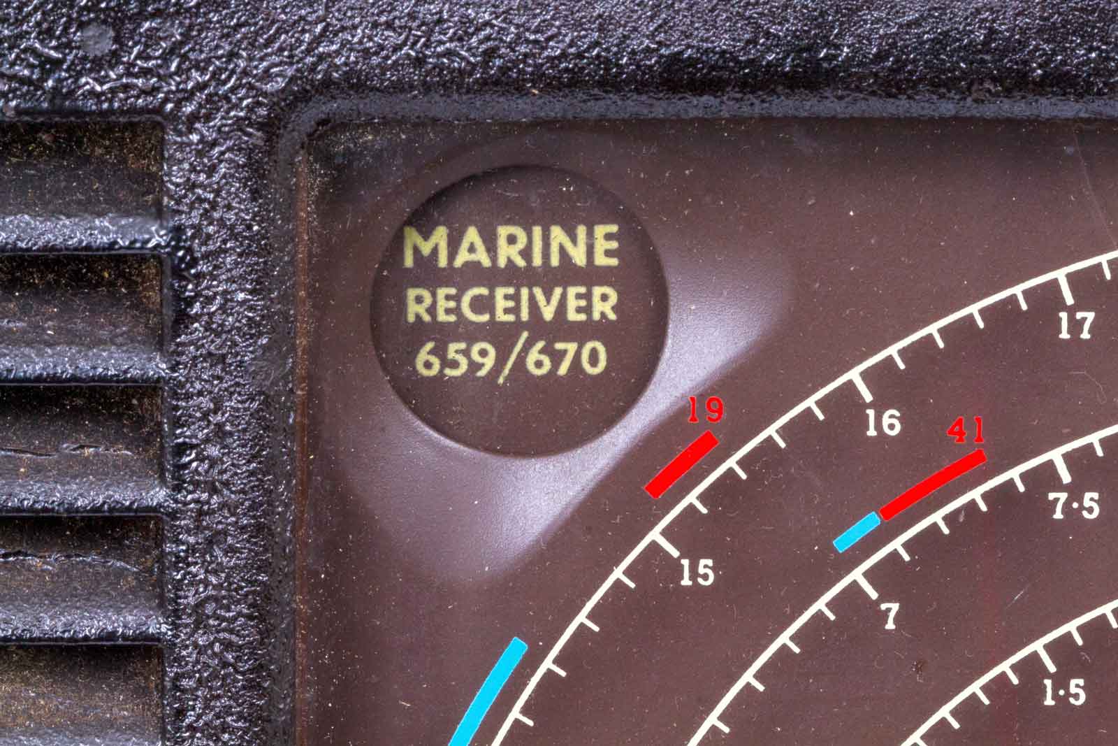 Het gat voor het afstemoog waar nu een afdekplaatje is aangebracht met de tekst "MARINE RECEIVER 659/670". Toch wel praktische mensen die Engelsen....