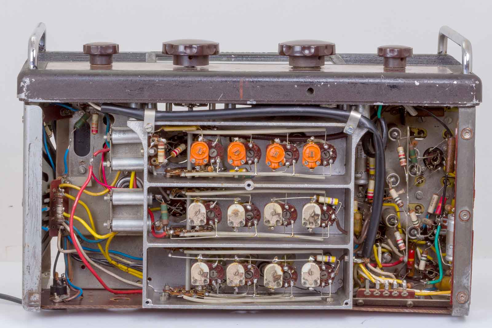 De rechter kant met twee MF-trafo's. De HF-trap gebruikt een UAF41 of 42, de mentrap en oscillator een UCH 41 of 42, MF versterker UAF41 of 42, 1. LF-trap en detector UAF41 of 42, 2. LF-trap tevens fasedraaier UAF41 of 42 en dan nog twee UL41 als balanseindtrap. De anodespanning wordt met een seleencel gelijkgericht.