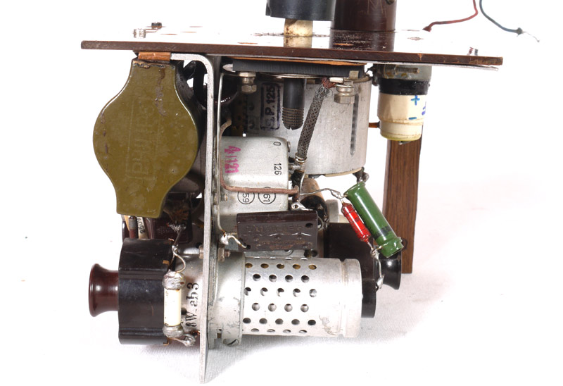 De bovenkant, rechts boven een LF-trafo van Philips. Onder de voeten van twee RV2P800's . Het lichte deel in het midden lijkt op de MF-trafo.