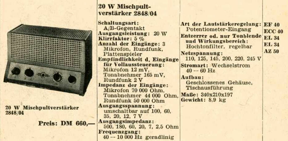 Deze, in 1951 geproduceerde versterker, was goed voor een uitgangsvermogen van 20 Watt. Het apparaat beschikt over twee microfooningangen, een pick-up- en een radio-ingang.