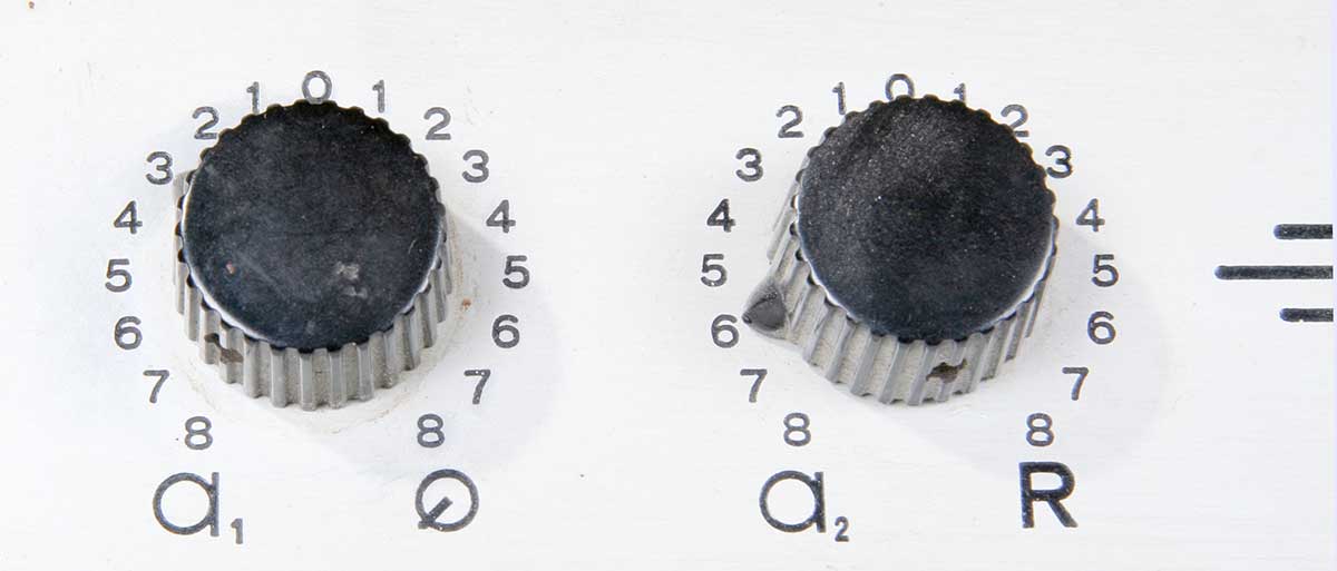 De twee, dubbele volumeregelaars. Links voor microfoon 1 en platenspeler, rechts microfoon 2 en radio.