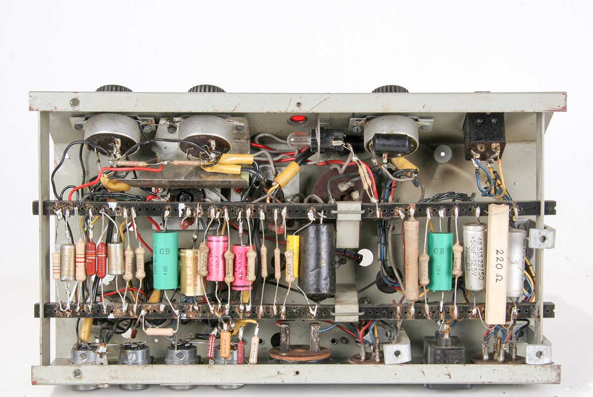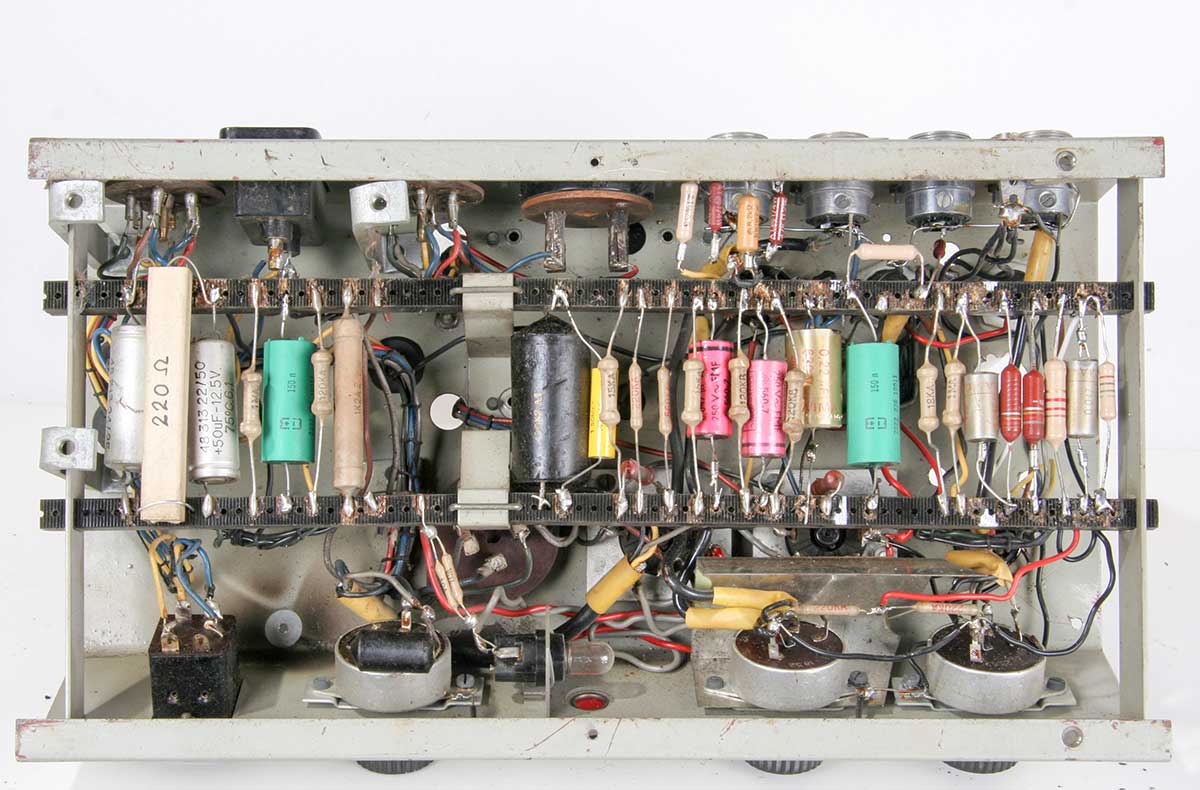 Het bovenaanzicht van deze forse versterker met rechts de voedingstrafo, het opgenomen vermogen bedraagt 112 Watt bij een output van 20 W.