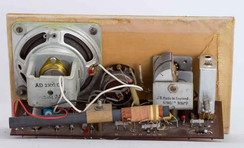 Aan het binnenwerk is niet veel veranderd, het kapje op de spoel zit er weer op en de batterij is vervangen door een hedendaagse. Het resultaat was een ca. 4 sekonden spelend radiootje. Ik denk dat er een elcootje in rook opgegaan is.