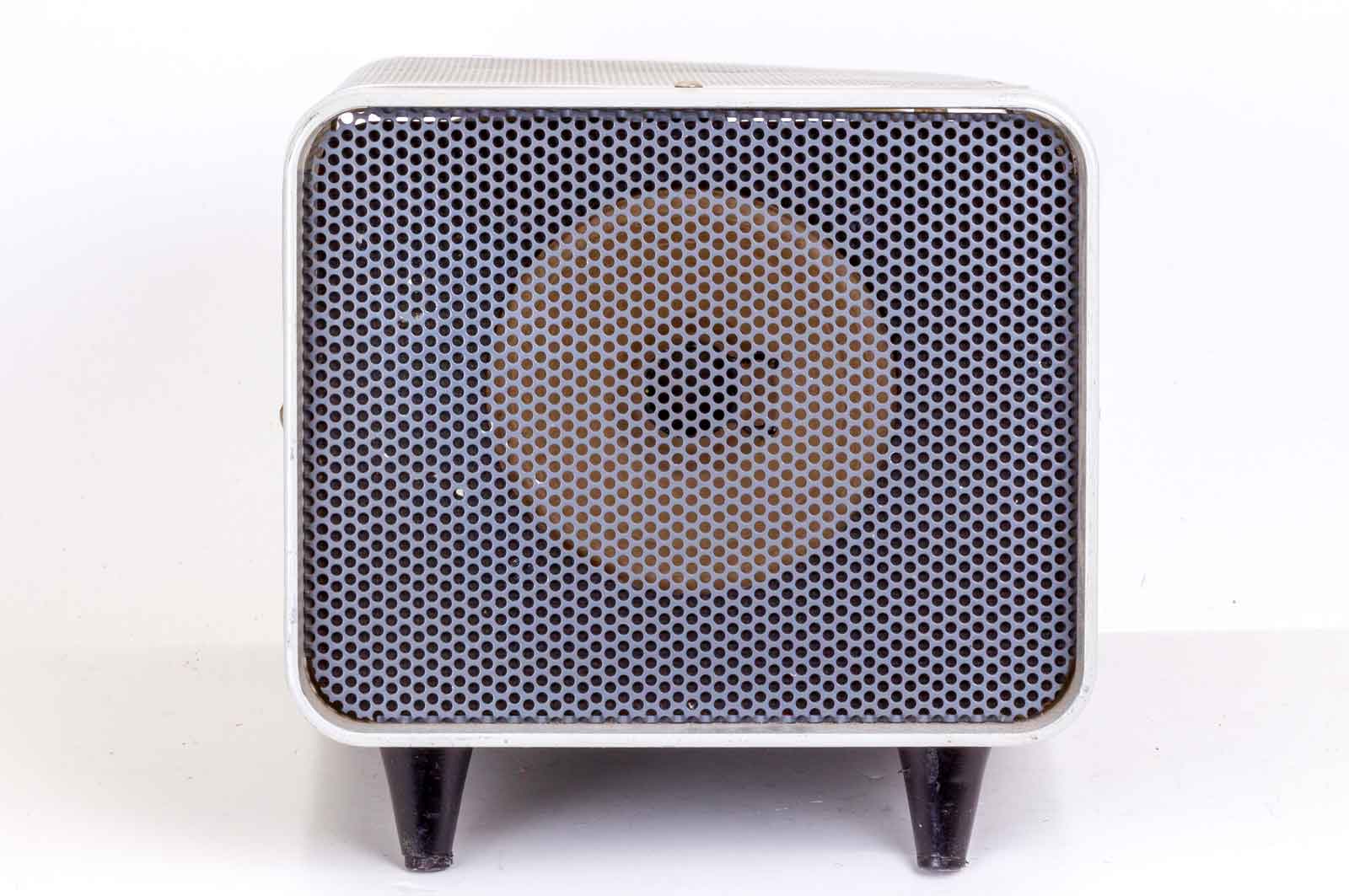 Vooraanzicht met een duidelijk zichtbare luidspreker-conus. Je kijkt een beetje krom op de behuizing, of het ligt aan mijn bril of de kast is inderdaad een beetje scheel.