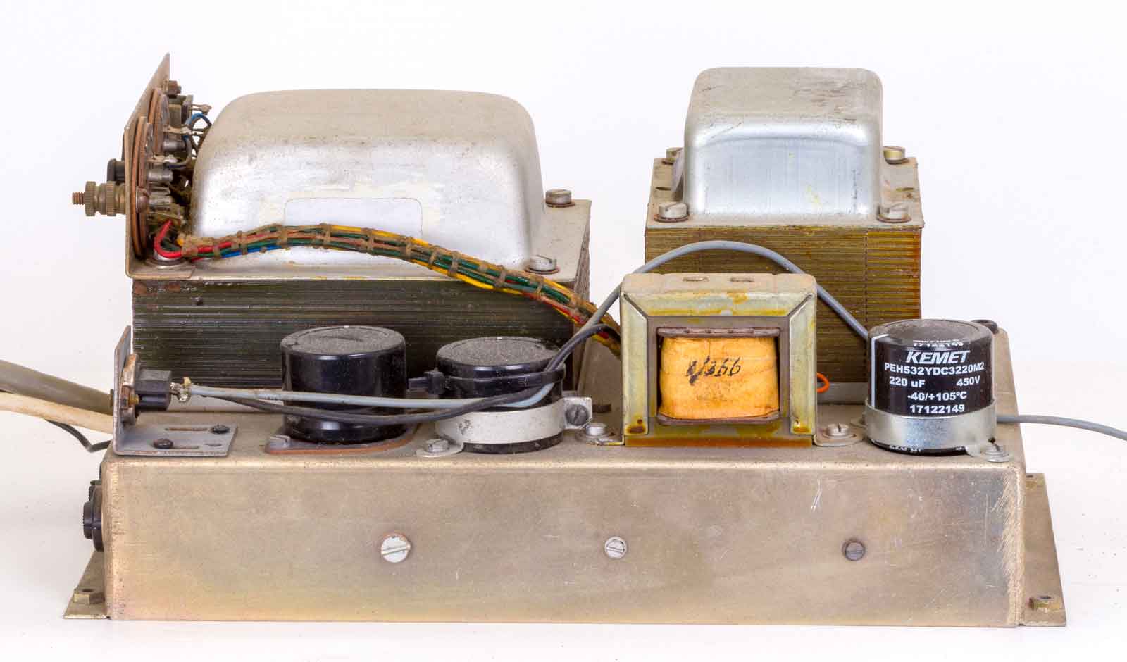 Links de trafo voor de hoogspanning van de eindtrap, rechts daarvan de voeding voor rest. Op de voorgrond de smoorspoel van het "laag"-spanningsgedeelte. De oorspronkelijke elco's zijn vervangen door de veel kleine en vooral betere Kemet's.