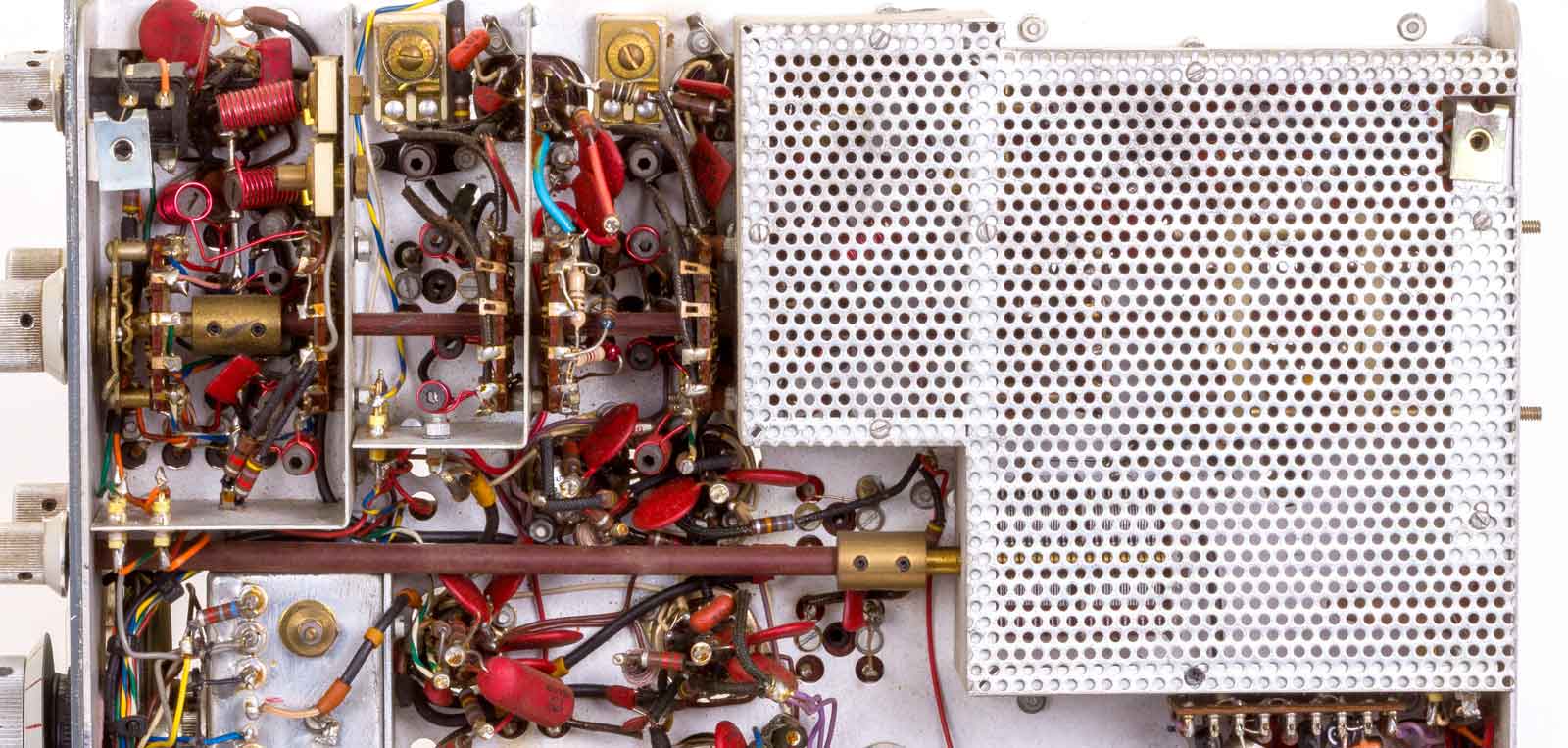 Het rechthoekje de vier afschermbussen is de BFO waarbij de onderste en de bovenste van drie buisafschermbussen de zijband-kristallen zijn. Rechts daarvan de ECL82 met een helm op de kop. De grotere ronde bus onder de VFO is het mechanisch filter.